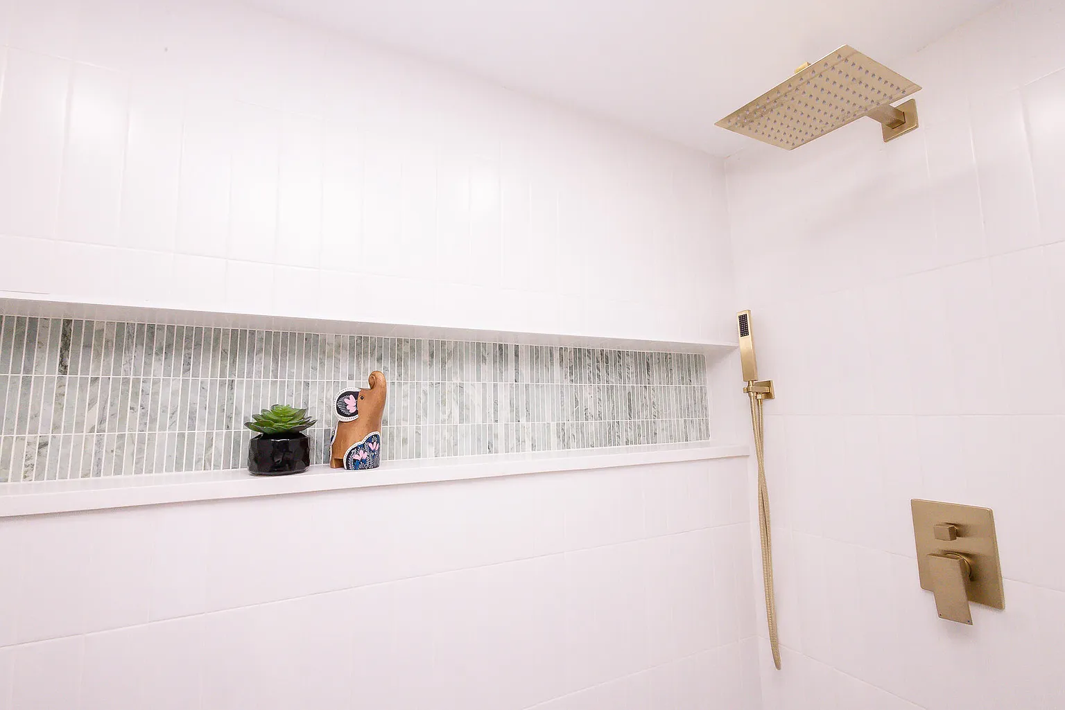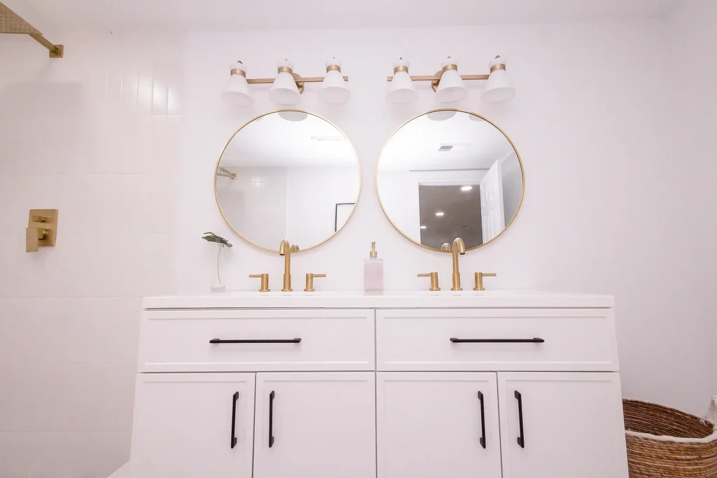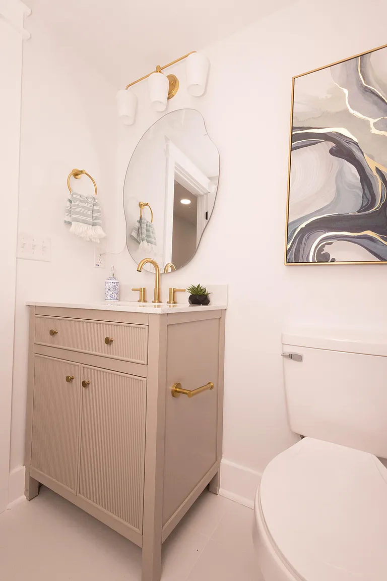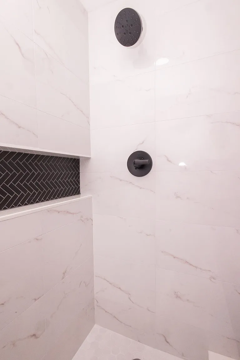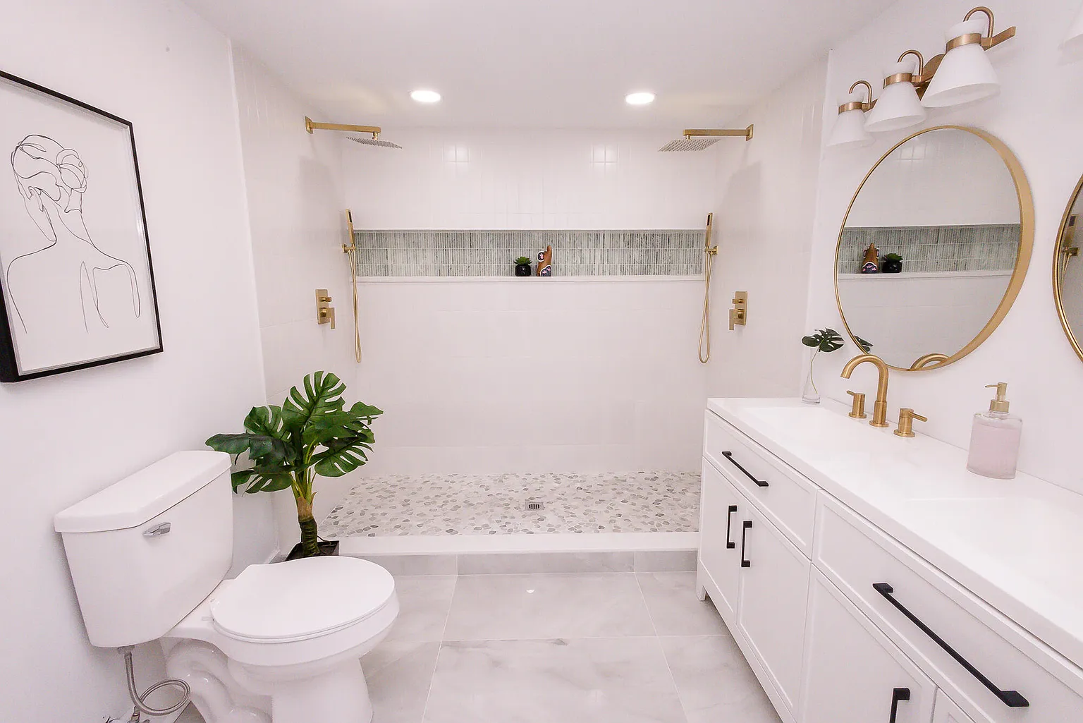 This project involved the complete renovation of three residential bathrooms, transforming outdated spaces into modern, spa-like environments. The renovation featured marble-look porcelain flooring and wall tiles throughout, with herringbone pattern ceramic tiles in shower areas and built-in niches with glass mosaic accent tiles. Key design elements included brushed gold hardware and plumbing fixtures, contemporary white vanities with textured cabinet fronts, quartz countertops with undermount sinks, and round gold-framed mirrors. The spaces incorporated modern rainfall showerheads, hexagonal mosaic flooring in shower bases, and a clean white color palette with warm gold accents. Mixed textures created visual interest while integrated storage solutions and layered lighting with vanity sconces and recessed ceiling lights enhanced functionality. Contemporary artwork and decorative plants added finishing touches to create cohesive, luxury bathroom spaces that blend functionality with modern aesthetic appeal, significantly enhancing the home's value and daily living experience.