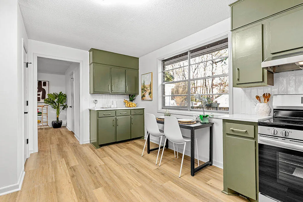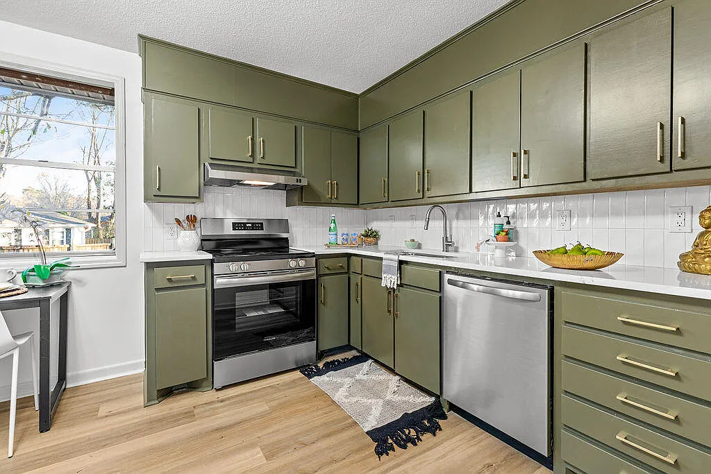 This project involved a complete kitchen renovation featuring a bold sage green color palette that creates a sophisticated and nature-inspired aesthetic. The renovation showcased full-height olive green shaker-style cabinets with sleek brushed gold hardware throughout the L-shaped layout, maximizing both storage and counter space in the compact area. White subway tile backsplash in a classic brick pattern provides bright contrast against the rich green cabinetry while white quartz countertops offer durability and visual balance. The kitchen features modern stainless steel appliances including a gas range with matching hood, dishwasher, and integrated refrigerator for seamless functionality. Natural light wood flooring flows throughout the space, adding warmth and creating visual continuity with adjacent living areas. A compact dining area with dark metal table and modern white chairs creates an intimate breakfast nook by the window, while contemporary ceiling lighting provides adequate illumination throughout the workspace. The design successfully transforms a standard kitchen layout into a striking focal point that balances bold color choices with practical functionality, creating a unique space that feels both modern and timeless while maintaining excellent workflow efficiency.