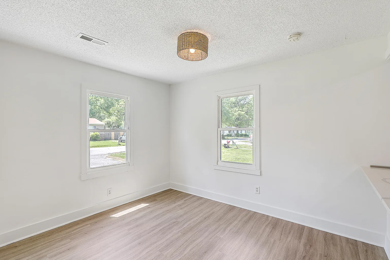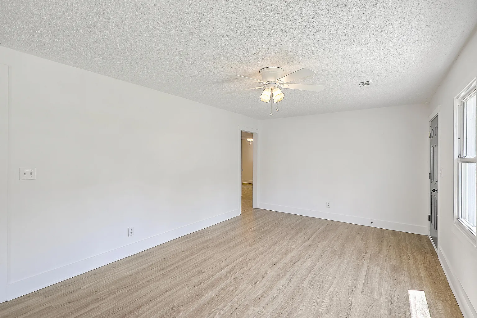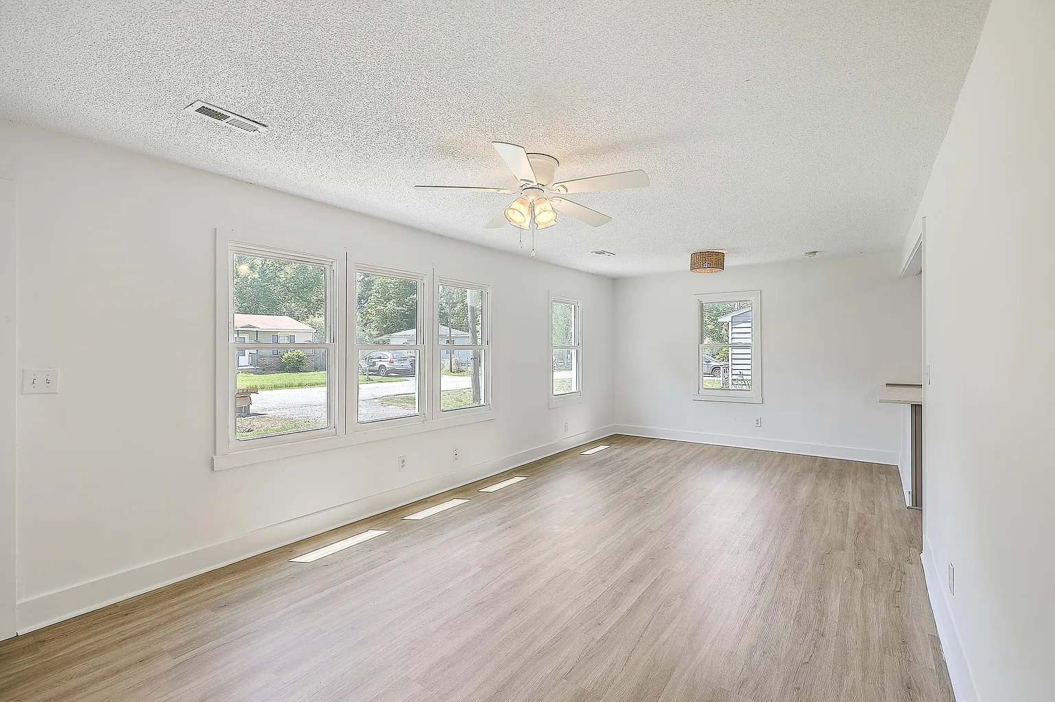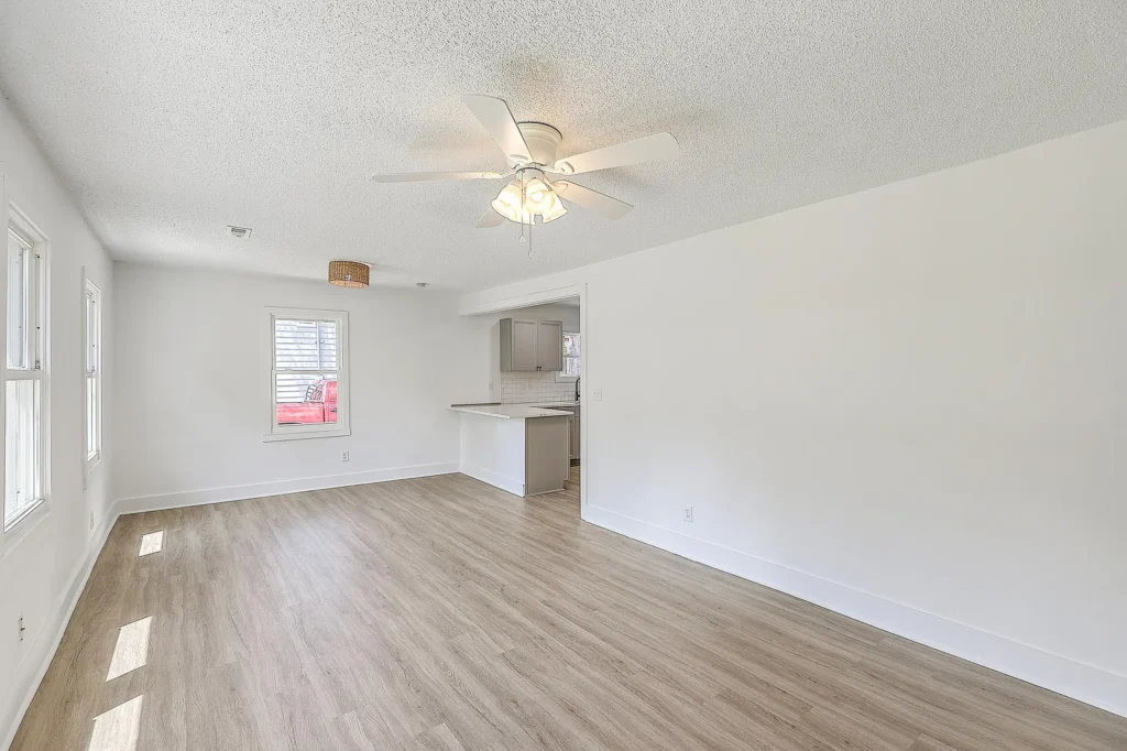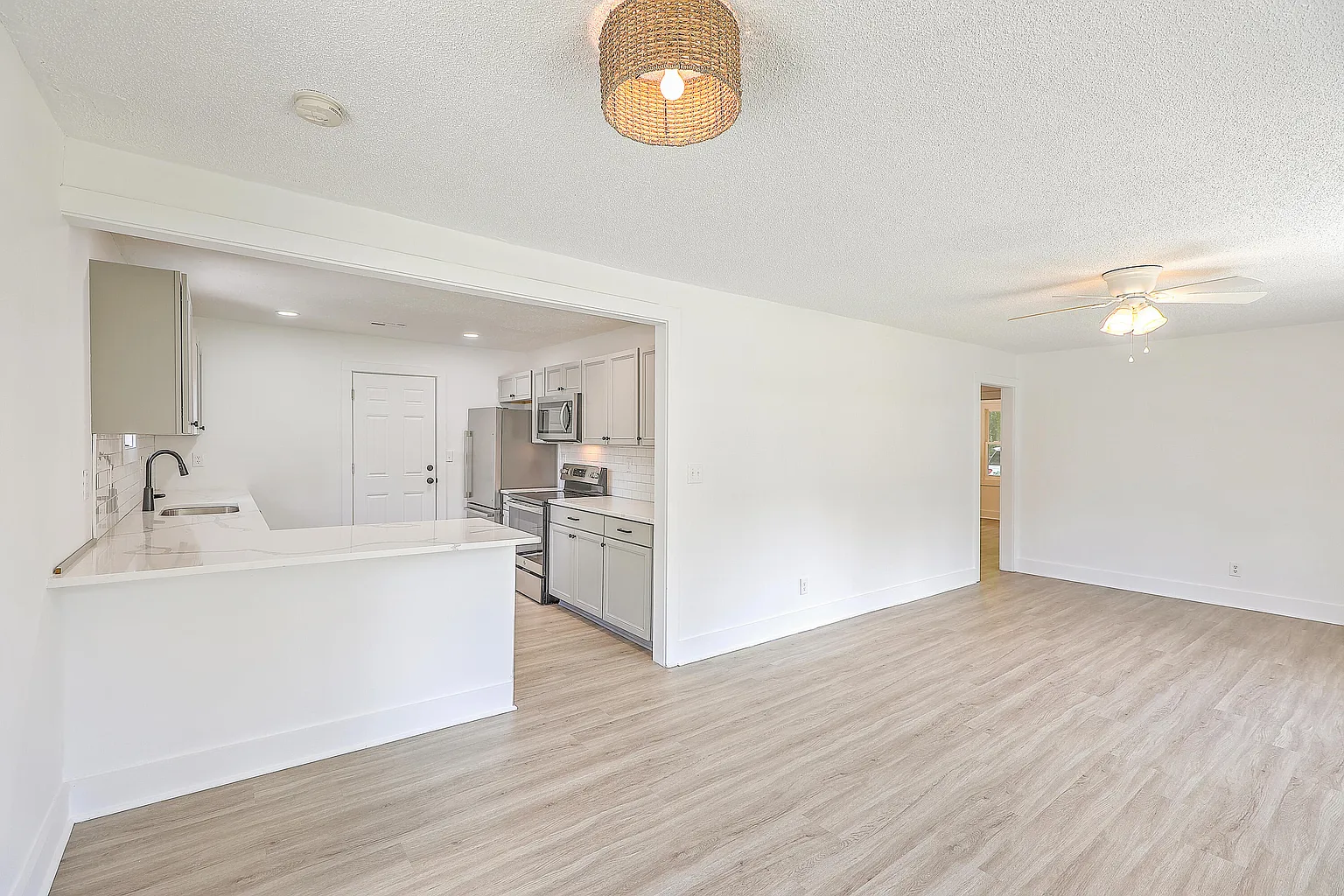 This project involved a complete home renovation that transformed the entire living space with a cohesive design approach emphasizing light, openness, and modern comfort. The renovation featured a comprehensive open-concept layout that seamlessly connects the kitchen, dining, and living areas through consistent design elements and materials. Fresh white walls throughout create a bright, airy atmosphere while luxury vinyl plank flooring in warm gray tones provides durability and visual continuity across all spaces. The kitchen showcases light gray shaker-style cabinetry with white quartz countertops and white subway tile backsplash, complemented by stainless steel appliances for a clean, contemporary aesthetic. Multiple rooms benefit from abundant natural light through strategically placed windows, while ceiling fans and woven pendant lighting provide both functionality and style. The design incorporates a sophisticated color palette anchored by a distinctive gray front door that adds character and curb appeal. Each room maintains individual identity while contributing to the overall flow, with generous proportions and clean lines that maximize the sense of space. The renovation successfully balances practical living needs with modern design sensibilities, creating a home that feels both comfortable for daily use and polished for entertaining, while the neutral foundation provides endless possibilities for personalization through furnishings and decor.