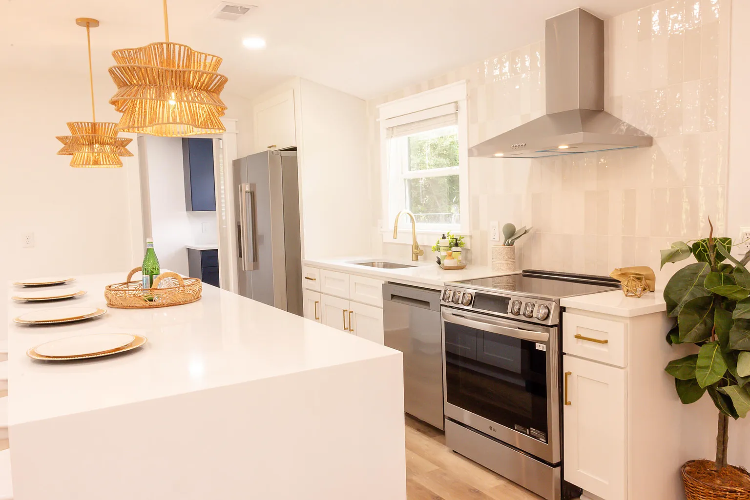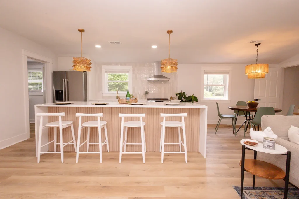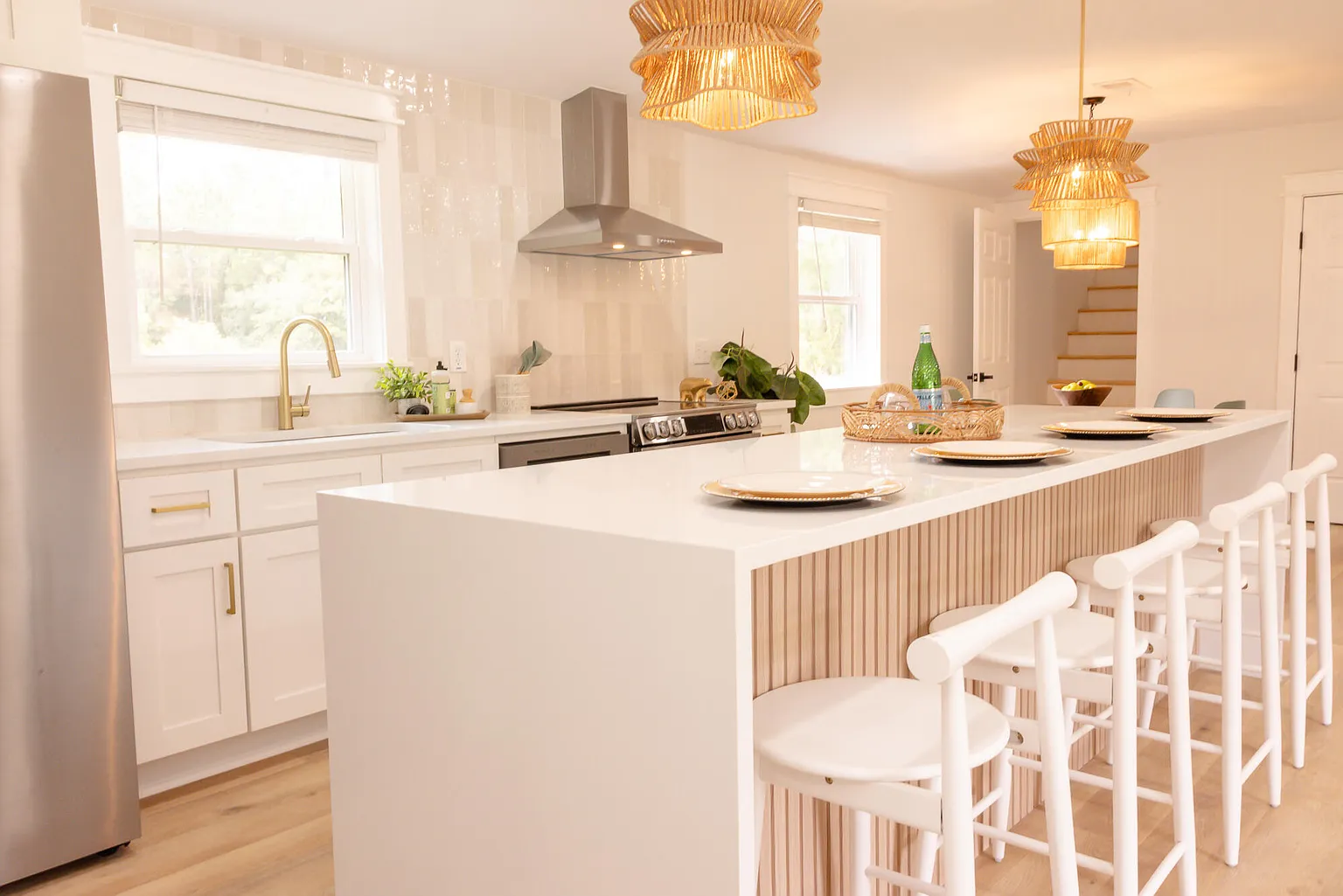 This project features a sophisticated kitchen renovation that seamlessly integrates modern functionality with warm, organic design elements. The renovation showcased a complete transformation featuring crisp white shaker-style cabinetry paired with luxurious white quartz countertops throughout the galley-style layout and oversized island. The standout design element includes a stunning fluted wood waterfall edge on the kitchen island, creating a striking focal point that adds natural texture and warmth to the space. Statement lighting plays a crucial role with layered woven rattan pendant lights in varying sizes that provide both ambient and task lighting while reinforcing the organic aesthetic. The kitchen incorporates high-end stainless steel appliances including a professional-style range with matching hood, built-in wine refrigerator, and full-size refrigerator for complete functionality. Natural light floods the space through multiple windows with clean white trim, while light oak flooring extends throughout the open floor plan connecting the kitchen to the adjacent living and dining areas. The design successfully balances clean modern lines with warm natural materials, featuring brushed gold hardware accents, integrated storage solutions, and a neutral color palette that creates an inviting yet sophisticated culinary workspace perfect for both daily use and entertaining.